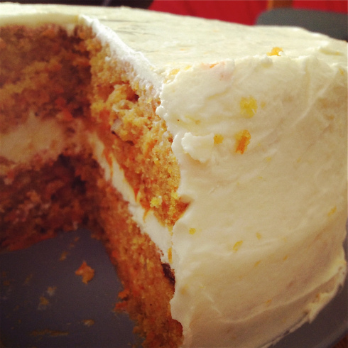 Frost the top of 1 cake layer with cream cheese mixture. Top with remaining layer. Frost the top and sides. Press nuts on sides of the cake, if desired. Store cake in the refrigerator. Makes 12 to 15 servings.