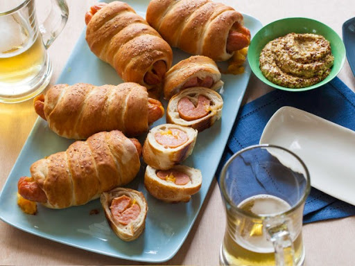 Behold the most gigantic pigs in a blanket you've ever come across, with a more meaty sausage center, a salty, yeasty pretzel roll and a hint of sharp Cheddar cheese for good measure. Appropriately super-sized for game day, these crowd pleasers can be served whole as main dishes or sliced into rounds for easy party finger food. If your kielbasa comes in long ropes, cut it into links about 4 1/2 inches in length.