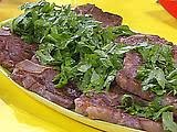 T-Bone Steaks with Chopped Green Garni, Broiled Tomatoes with Cheese, Olives and Herbs