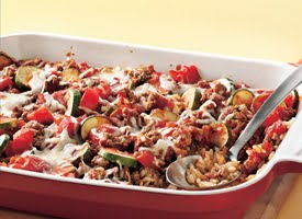 Place rice and water in baking dish; stir to mix. Layer cooked beef, zucchini and tomato over rice. Pour soup over top. Cut 16×12-inch sheet of foil; spray with cooking spray. Cover dish with foil, sprayed side down.