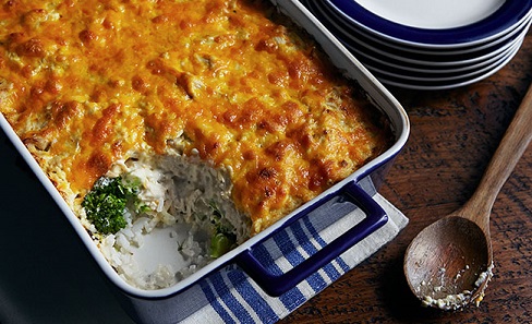 Spread the rice in an even layer in the baking dish. Top with broccoli. In a large bowl, mix the chicken, soup, half the cheese, Hellmann's® or Best Foods® Real Mayonnaise, sour cream, lemon juice, salt and pepper. Pour this over the broccoli and top with remaining cheese.
