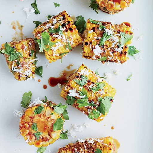 Light a grill. Grill the corn over medium heat, turning occasionally, until charred and tender, 10 to 15 minutes; brush with the glaze during the last 5 minutes. Cut each corn cob into thirds, transfer to a platter and garnish with cilantro and cheese. Serve with lime wedges.