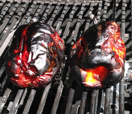 2. Place peppers on the grate for about 15 to 20 minutes until the peppers collapse and the skins are completely charred, turning them a few times during grilling. Remove the peppers from the heat and place in a tightly covered bowl for 30 minutes.