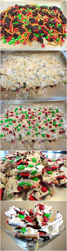 1.First, line a baking sheet with waxed paper. Mix on the sheet the Oreos, pretzels and ¾ cup of the M&M’s.