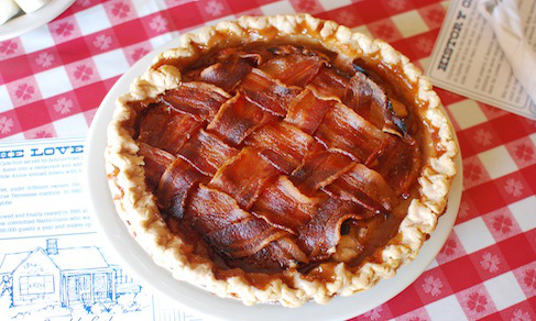 Weave uncooked bacon on top of the pie filling, starting from the center and working your way out to the edges. For a lattice topping you should have an over-under pattern with 5 pieces going vertically and five pieces going horizontally. Trim the edges and pinch into the crust to seal. Cover pie with foil and bake in the middle of the oven for 1 hour. Remove cover. Continue baking for 15 minutes until golden brown and bacon is crisp.