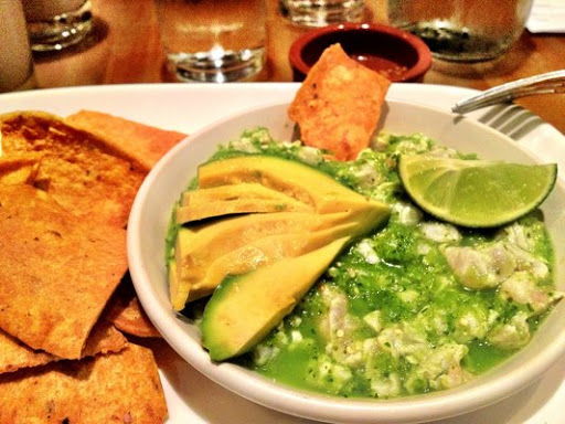 En un tazón, platón o lo que tenga que se vea decente para servir el ceviche, colocar el pescado, la cebolla escurrida, el cilantro picado y la salsa verde, ésta la debe ir poniendo poco a poco, hasta que el ceviche tome sabor y color, a su gusto tanto de picante como de sabor. Mezclar cuidadosamente todos los ingredientes. Por favor no haga batidillo, trátelo con amor, solo debe incorporar unos ingredientes con otros.
