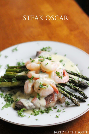 Place each filet steak on a plate and place three to four asparagus spears on top. Pile on some sauteed shrimp and drizzle on some hollandaise Sprinkle on the parsley and serve.