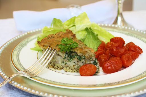 Step 4: Prebake the crust for 10 minutes. Remove the parchment paper and weights and brush the crust with the egg white. Return to the oven and bake for another 5 minutes. Remove from the oven, leaving the oven on, and proceed to making the quiche.