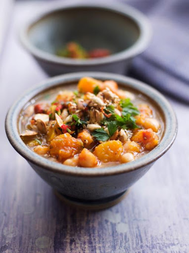 Drop in the roasted squash and let it sweat for a few minutes, then pour in the stock. Bring to a boil, turn down the heat and simmer 15 minutes. Add chickpeas and simmer 15 minutes more.
