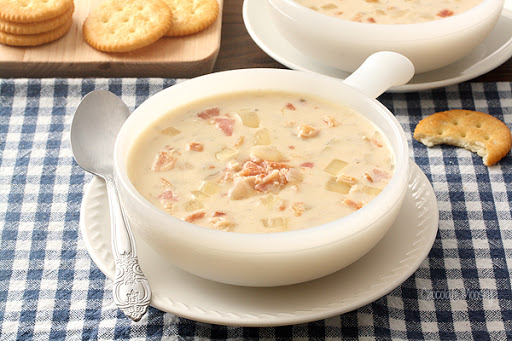 Add the flour, chives, and salt to the cooked onions. Gradually stir in the broth. Bring to a boil, stirring often. Once boiling, cook for 5 minutes until the broth starts to thicken slightly. Add the cream, cheese, and crumbled bacon. Cook another 1-2 minutes then serve immediately.