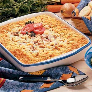 Pour into a greased 2-1/2-qt. baking dish. Combine saltines and butter; sprinkle over noodles. Bake, uncovered, at 350° for 35-45 minutes or until heated through.