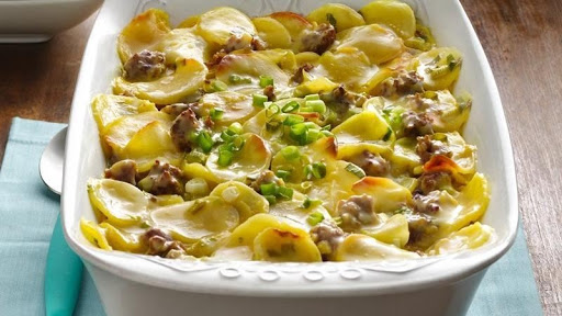 3 Bake uncovered 35 minutes. Top with 2 tablespoons green onions. Bake 5 minutes longer or until potatoes are tender. Let stand 5 minutes before serving (sauce will thicken as it stands).