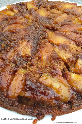 Run a small knife around pan edge. Place a serving plate on top of the pan and turn plate and pan over together. Carefully remove pan. If any apples remain in the pan, place them on the cake.