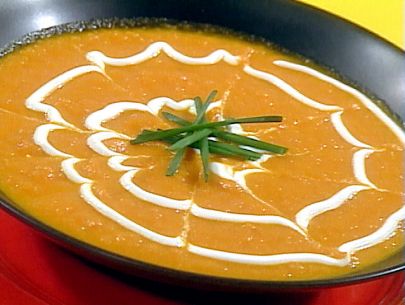 Preheat medium pot over medium high heat. Add olive oil, butter, onions and carrots and saute 5 minutes. Add 4 cups chicken stock, curry and cayenne, and about 1 teaspoon salt to the pot. Bring to a boil, cover and cook until carrots are very tender, about 15 minutes. Place pot on a trivet next to food processor. Process soup in 2 or 3 small batches until soup is smooth and carrots are fully pureed. Transfer processed soup into a large bowl as you work to make room for more soup in the food processor. Return completed soup to the soup pot and place back over low heat. If the soup is too thick, add remaining stock, up to 2 cups, to achieve desired consistency. Adjust seasonings. Place sour cream in a plastic condiment squeeze bottle or into a medium food storage bag. Cut a very small hole in the corner of the bag with scissors. Ladle soup into bowls and squirt a swirl of sour cream around the bowl from the center out to the rim. Drag a toothpick from the center of the bowls out to the edges, forming a spider web design on soup. Pile a few pieces of cut chives at the center of each bowl to resemble green spiders in their webs! Cool!