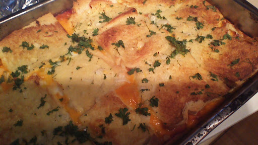 Melt 1/4 pound of butter and pour over top. Cover with crushed corn flake crumbs.