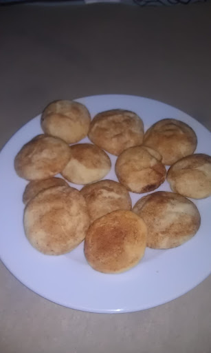 2. Stir together cinnamon and remaining sugar into a small bowl. Shape dough into 1 3/4 inch balls; roll in cinnamon sugar. Space 3 inches apart on baking sheet lined with parchment paper.