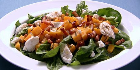 Spoon warm squash over spinach greens, on a plate or platter and dollop ricotta on top. Drizzle with olive oil and finish with a little sprinkling of salt & pepper. Serve immediately.