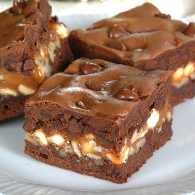 COMBINE flour, cocoa and salt in small bowl. Beat butter, granulated sugar and brown sugar in large mixer bowl until creamy. Add 2 eggs, one at a time, beating well after each addition. Add vanilla extract; mix well. Gradually beat in flour mixture. Reserve 3/4 cup batter. Spread remaining batter into prepared baking pan. Sprinkle nuts and white morsels over batter. Drizzle caramel topping over top. Beat remaining egg and reserved batter in same large bowl until light in color. Stir in semi-sweet morsels. Spread evenly over caramel topping.