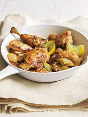 Set the skillet over medium heat. Cook until the onions are very soft and the chicken and onions have turned golden brown, about 20 minutes. If the onion begins to brown too fast, turn down the heat. Add the wine and bring to a boil. Reduce the heat, cover the pan, and simmer gently until the chicken is tender, about 20 minutes. Squeeze the lemon over, taste for salt and pepper, and serve