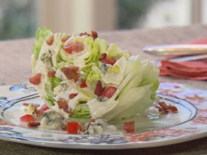 Serve a generous dollop of dressing over each lettuce wedge. Top with the crumbled bacon and diced tomato.