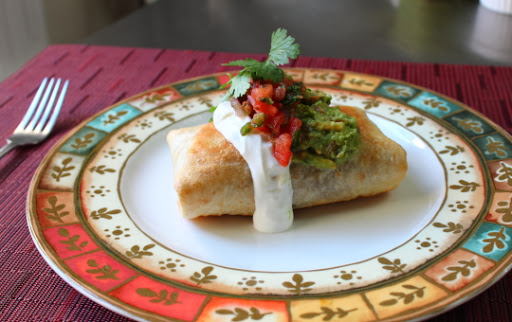 Bake in the preheated oven until puffed up, golden brown, and the outside is crisp, 12 to 15 minutes. Spoon 1 T guacamole, 1 T sour cream, 1 T salsa, and 1 T cilantro onto each chimichanga.