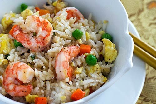 5 Drizzle the soy sauce all around the rice and toss. Add the peas and carrots, the cooked eggs, shrimp and sesame oil, tossing to mix the rice evenly with all of the ingredients. Let everything heat back up again, until the rice grains are so hot they practically dance! Taste and add an additional 1 teaspoon of soy sauce if needed.