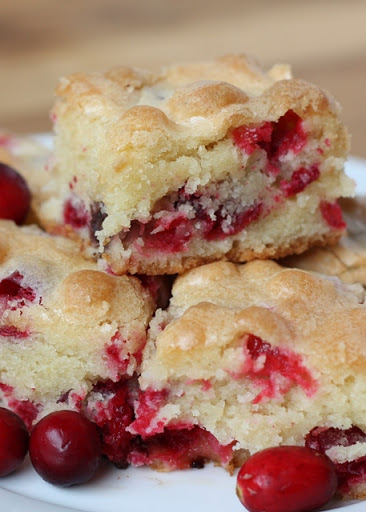 Preheat oven to 350 degrees. With a mixer, beat the eggs with the sugar until slightly thickened and light in color, about 5-7 minutes. The mixture should almost double in size. The eggs work as your leavening agent in this recipe, so do not skip this step. This mixture should form a ribbon when you lift the beaters out of the bowl. Add the butter and vanilla; mix two more minutes. Stir in the flour until just combined. Add the cranberries and stir to mix throughout.