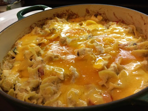 Slice up the tomatoes and gently mix them in, then fold in the noodles. If the casserole looks or tastes too dry, add another can of cream of mushroom soup, or 1/2 to 1 cup of any kind of milk. Taste, and add salt as necessary. Put the whole thing into a large dutch oven or other casserole, and bake, covered, for 30 to 40 minutes.