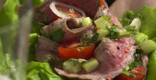 3. Combine the sliced steak, cucumber, tomatoes, shallot, mint, basil and cilantro in a large bowl. Mix sugar, soy sauce, lime juice and crushed red pepper in a small bowl. Drizzle over the steak mixture; toss well to coat. To serve, spoon a portion of the steak mixture into a lettuce leaf and roll into a "wrap."