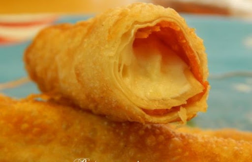 On top of an egg roll wrapper, place three pieces of pepperoni as shown in the picture. Place a piece of string cheese on top. Fold corners over cheese. Fold bottom corner over cheese and pepperoni and keep rolling until cheese is tightly sealed. Moisten corners with water to seal. Repeat with the rest of wrappers, cheese and pepperoni.
