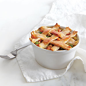 3. Cut a 9-inch circle of refrigerated pie dough into 3/4-inch-wide strips. Weave strips over filling; coat with cooking spray. Bake at 425° for 30 minutes. May be prepared in 6 (10-ounce) ramekins.