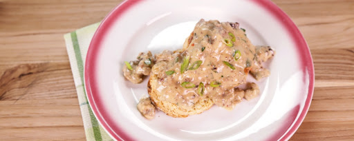To serve, slice the Biscuits in half. Spoon the Gravy over the Biscuits and garnish with Parsley.