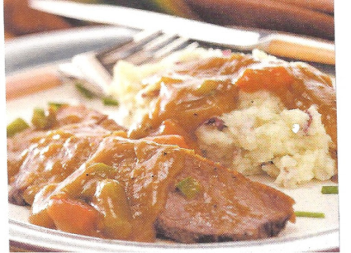 Drain potatoes; mash with Alfredo sauce, butter and pepper. Sprinkle with chives. Serve with sliced beef and gravy.