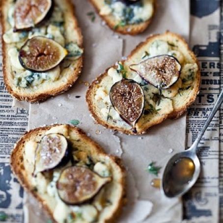 Line a sheet pan with parchment paper. Place the slices of bread in the pan. Top each slice with about a tablespoon of gogonzola. Top with two fig halves. Sprinkle a little thyme. Repeat for the remaining tartines. Salt and pepper to taste.