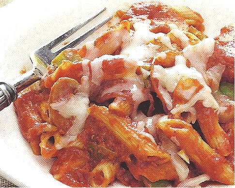 1. Cook pasta according to package directions. Meanwhile, combine 2 1/3 cups spaghetti sauce, pepperoni, mushrooms, green pepper, onion, Parmesan cheese, garlic powder, salt, pepper and red pepper flakes in a bowl. Drain pasta; add to sauce mixture and mix well.