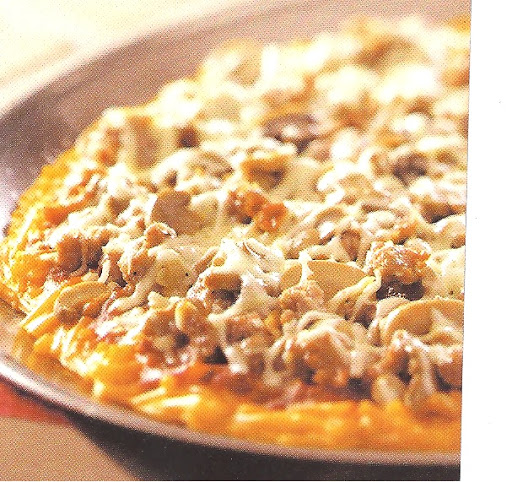 In a small bowl, combine the tomato sauce, basil and oregano. Spread over macaroni mixture. Layer with sausage mixture, mushrooms and cheese. Bake for 10 minutes or until cheese is melted.