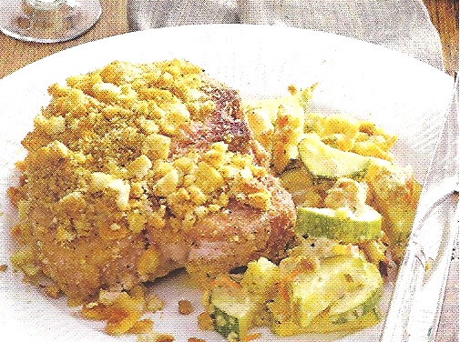 Crush remaining stuffing mix; place in a shallow bowl. In another shallow bowl, add the water or milk. Dip pork chops in water or milk then roll in stuffing crumbs.