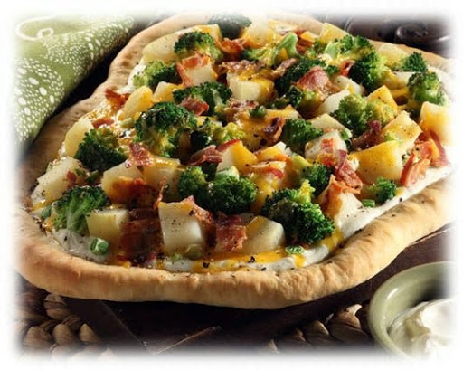 Spray counter lightly with non-stick cooking spray. Combine rolls together and roll into a 10x13-inch oblong shape. Place on a sprayed baking sheet. Poke with a fork several times to prevent bubbles from forming and pre bake at 350°F 10-15 minutes. Remove from oven to cool. Peel potato and cut into 1/2-inch cubes. Combine sour cream and ranch dressing and spread over cooled crust. Sprinkle with 1/2 cup cheese. Top with potato, bacon, broccoli, green onion and remaining cheese. Salt & pepper to taste. Bake an additional 10-15 minutes or until cheese is nicely melted.
