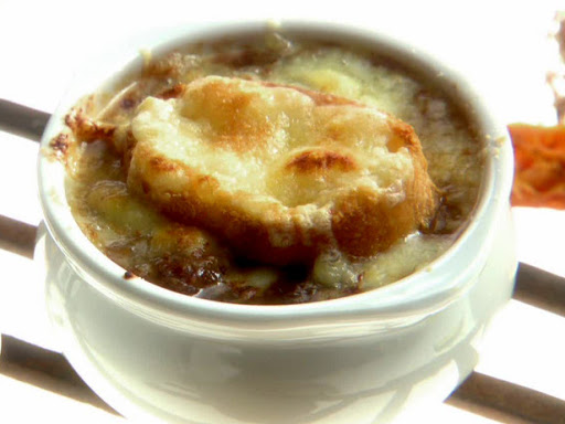 * To serve, ladle soup into individual serving dishes, top with croutons and cheese and place under broiler and toast until cheese is golden and melted.