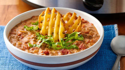 To reheat: Defrost overnight in refrigerator, or in microwavable bowl on Defrost setting in microwave, stirring often. Then microwave uncovered on High 4 to 6 minutes or to 165°F. Serve with freshly cooked waffle fries and shredded lettuce.