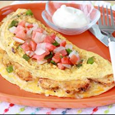 What could be a better breakfast than a light, satisfying omelet, prepared perfectly? A little cheddar, onion, diced mushrooms, peppers and ham add flavor. Yes please and thank you!