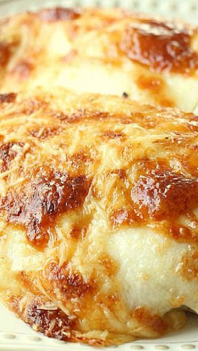 In a bowl mix mayonnaise, sour cream, 1/2 cup Parmesan cheese, salt, pepper and garlic powder. Spread this over chicken and sprinkle with remaining Parmesan cheese.