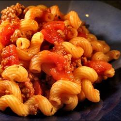 Brown ground beef and onion until it loses red color, breaking up with fork. Drain the grease and add the tomatoes, soup and salt & pepper. Stir in the cooked macaroni and mix well. Put in a baking dish.