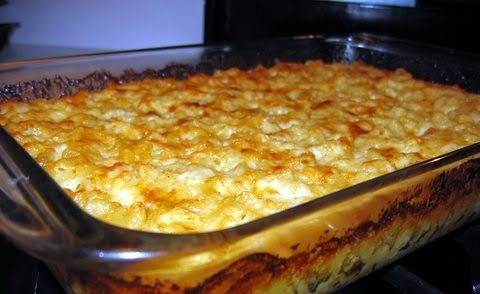3. Layer 1/2 elbow mac over melted butter with 1/2 each Velveeta cheese and shredded cheese and 1/2 milk mixture.