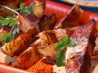 Brush the potato wedges with oil, sprinkle with salt and pepper and grill until nicely charred and cooked through, 2 to 3 minutes per side.