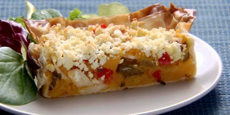 To assemble tart, increase oven temperature back to 375 F. Spread out 1 sheet of phyllo (keeping other sheets covered). Brush lightly with garlic oil and lay another sheet over. Continue layering remaining phyllo sheets, brushing with garlic oil between each layer. Fold phyllo in half lengthwise and gently lift and place in an ungreased rectangle (4-x- 10 inch) removable-bottom tart pan. Spoon squash filling into tart shell and crumble feta over. Bake for 20-25 minutes, until phyllo is a rich brown.