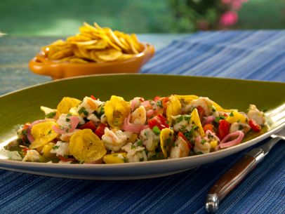 Ceviche (Shrimp and Grouper) with Serrano Chiles, Mango, Smoked Tomatoes, Crispy Plantain Chips