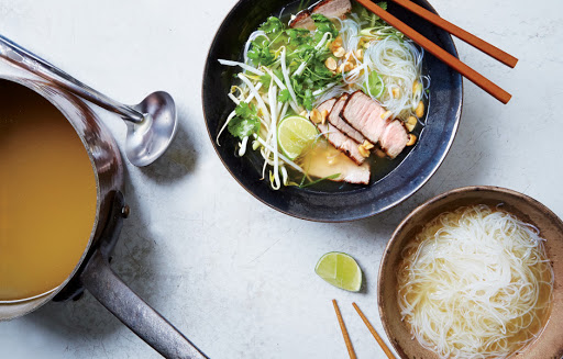 Cook noodles according to package directions. Divide among bowls; add pork. Strain broth and ladle into bowls. Top pho with bean sprouts, cilantro, scallions, and peanuts and serve with lime wedges.
