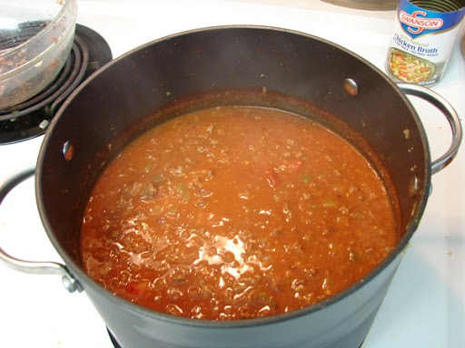 Add the chili mixture from the blender, add beef or chicken stock, tomato sauce and half of the kidney beans. Using an immersion blender, blend till smooth.