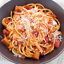 To create an authentic-tasting version of Pasta All’Amatriciana we needed an alternative to hard-to-find guanciale, or cured pork jowl. Humble salt pork, though an unlikely solution, provided the rich, clean meatiness we were after. To ensure tender bites of pork throughout, we first simmered it in water to gently cook it and render fat, a step that allowed the meat to quickly turn golden once the water evaporated. Finally, to ensure the grated Pecorino Romano didn’t clump in the hot sauce, we first mixed it with a little cooled rendered pork fat. Now the flavor of pork, tomato, chili flake, and Pecorino shine through in each bite.